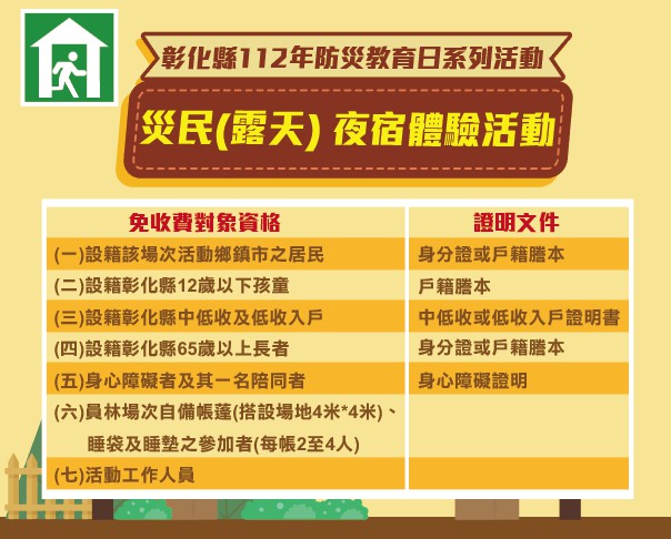 - 本次活動帳篷區報名帳棚數為80帳(優先報名者屆時會依報名順序優先登記慈濟福慧床),每帳申請名額以2至4人(含聯絡人)為上限,錄取名單於112年10月18日在彰化縣防災資訊網公布。